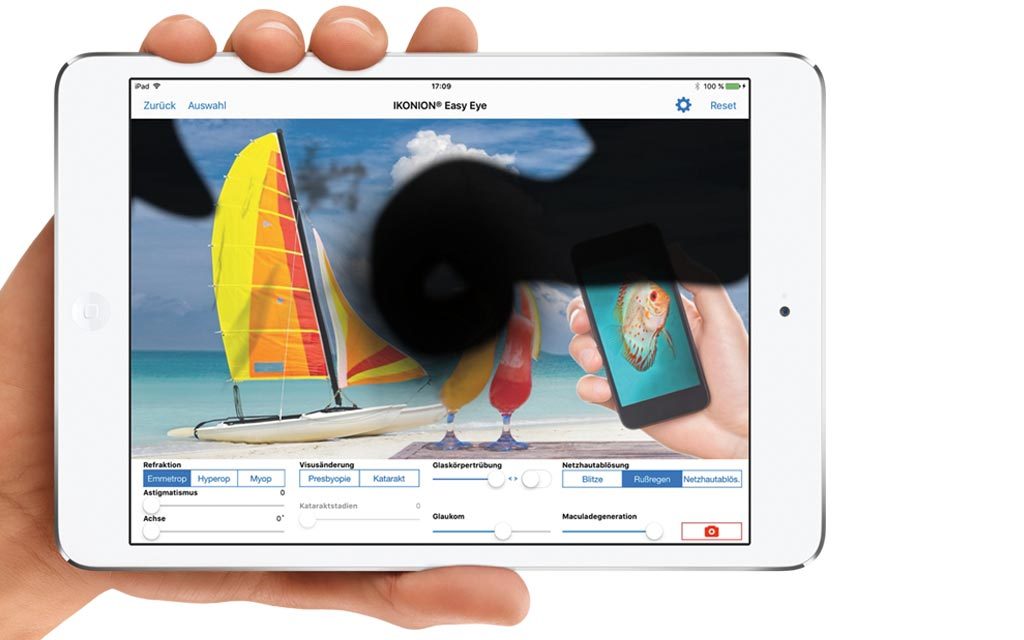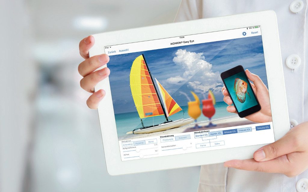 IKONION® Easy Eye Tablet steht für eine einfache, Zeit sparende Patientenaufklärung. Mit dem neuen Vision Simulator kommt zu den leicht zu verstehenden 3D Animationen eine einfache, intuitive Lösung, um verschiedene Sehkraftkorrekturmöglichkeiten aufzuzeigen.